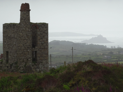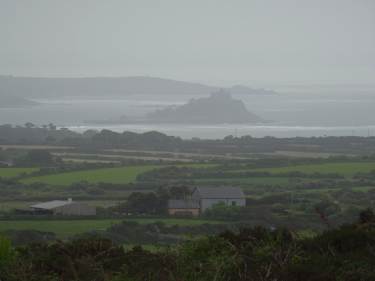 Romantic Cornish vista across a misty landscape towards magical St Michael's Mount